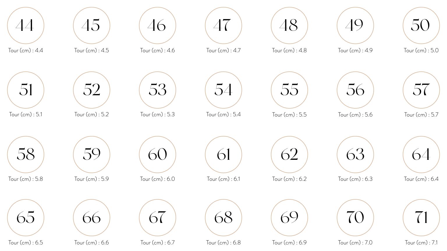 • Vous pouvez connaître votre taille de doigt en vous rendant en showroom, en utilisant un baguier envoyé chez vous, ou en mesurant votre doigt avec une bande de papier (par exemple, 52 mm correspond à une taille 52).