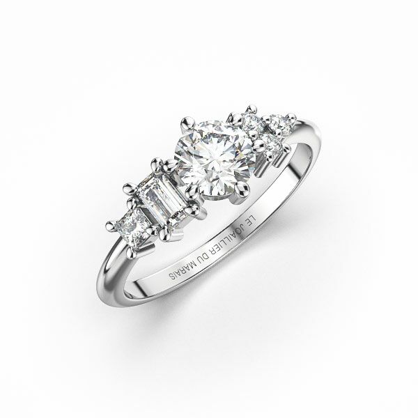 La bague Céline joue l’asymétrie et étonne avec une composition de pierres de tailles diverses. Réalisable en or blanc, jaune, rose 750‰ et en platine 950‰, elle est sertie d'une pierre centrale de 0.40 carat personnalisable selon vos envies (saphir, diamant, émeraude, rubis...). Entourée d'un coté par 3 diamants de forme brillant, et de l'autre coté d'un diamant de forme princesse et taille émeraude, c'est un bijou à la fois original et raffiné, qui restera simple à porter au quotidien.Recevoir votre baguier