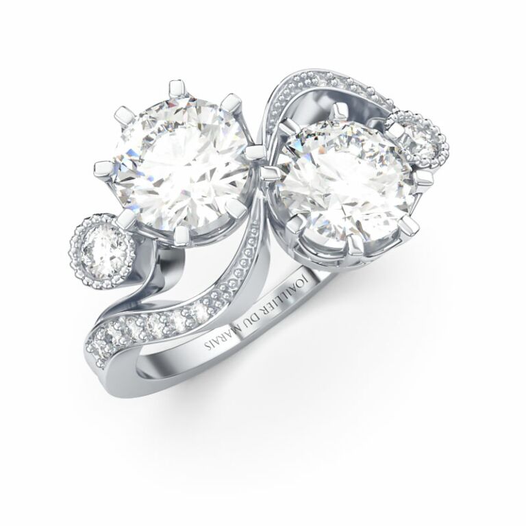Captivés par l’arrivée des beaux jours, nous avons symbolisé la beauté d’une fleur dans une création joaillière travaillée et minutieuse. La flore est une inspiration qui caractérise la joaillerie et ce particulièrement aux 19ème et 20ème siècle. Nous avons eu à coeur de faire honneur à la traditionnelle bague de fiançailles Toi & Moi tout en l'associant à la délicatesse des inspirations d'antan.