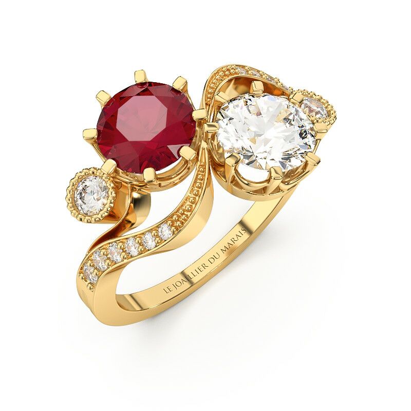 Captivés par l’arrivée des beaux jours, nous avons symbolisé la beauté d’une fleur dans une création joaillière travaillée et minutieuse. La flore est une inspiration qui caractérise la joaillerie et ce particulièrement aux 19ème et 20ème siècle. Nous avons eu à coeur de faire honneur à la traditionnelle bague de fiançailles Toi & Moi tout en l'associant à la délicatesse des inspirations d'antan.