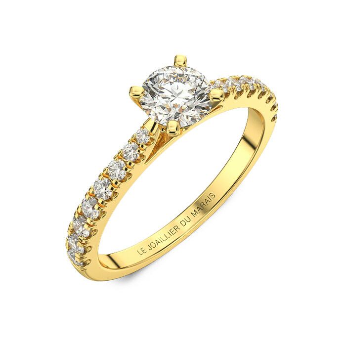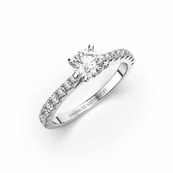 Solitaire accompagné dans un style traditionnel joaillerie, Dolly est sertie de 8 diamants en serti descendu poursuivant comme une ligne de lumière. En son centre une pierre au choix (diamant, saphir, émeraude, rubis...) montée en chaton 4 griffes. Il est également possible de la personnaliser au niveau du métal, en or blanc, jaune, rose 750‰ ou platine 950‰.