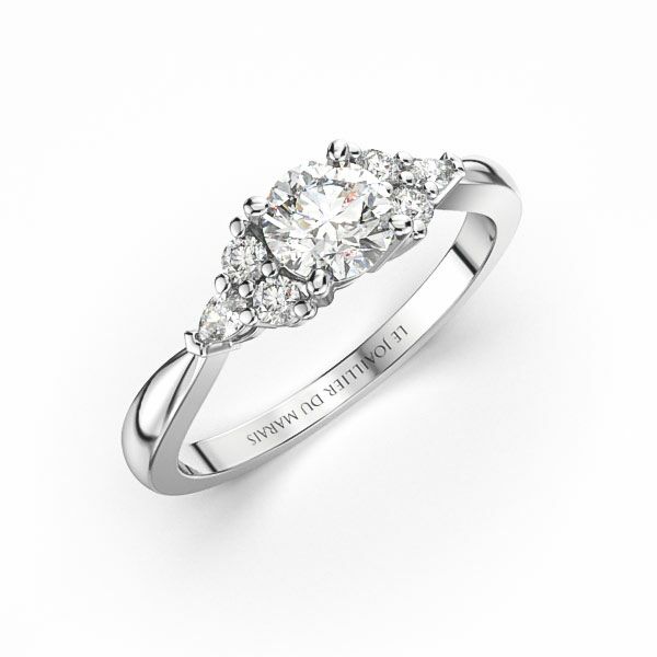 Ophélia est personnalisable en or blanc, jaune, rose 750‰ ou en platine 950‰. Elle est sertie d'une pierre de centre taille brillant de votre choix (diamant, rubis, saphir, émeraude...) et est entourée de quatre diamants tailles brillants et deux diamants tailles poires. D'inspiration vintage, elle représente la pureté et le raffinement.Recevoir votre baguier