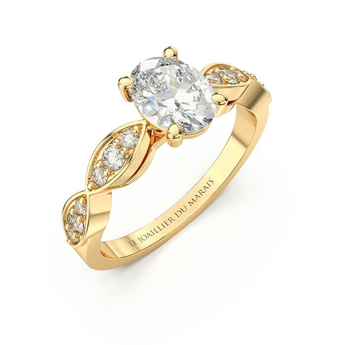 D’inspiration vintage, ELICIA est un solitaire aux lignes gracieuses et ondulées. Le corps de la bague aux formes de navettes serti de 3 diamants chacune, entourent et mettent en valeur la pierre centrale de 6x4 mm au choix (diamant, saphir, émeraude, rubis) qui nous révèle toute son élégance et sa beauté. Personnalisable en or blanc, jaune et rose 18 carats (750/1000) ainsi qu’en platine 950, vous avez également la possibilité de choisir la pierre centrale de votre choix : un diamant, une émeraude, un saphir, un rubis ou bien une pierre fine, de taille ovale.