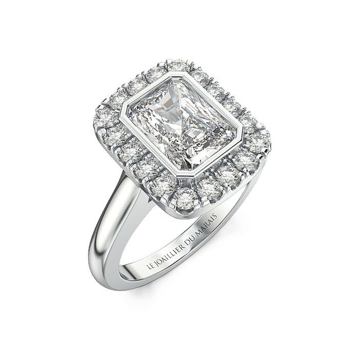 RACHEL est une bague entourage hexagonale aux proportions majestueuses avec sa pierre de centre taille émeraude accompagnée de diamants répartis entre l'entourage et l'accompagnement. Le corps est personnalisable en or blanc, jaune, rose 750‰ ou en platine 950‰, tout comme la pierre de centre, que vous souhaitiez un diamant, un rubis, une émeraude ou un saphir par exemple. Pour plus de personnalisation (type de pierre, poids de pierres), n'hésitez pas à nous contacter.Recevoir votre baguier