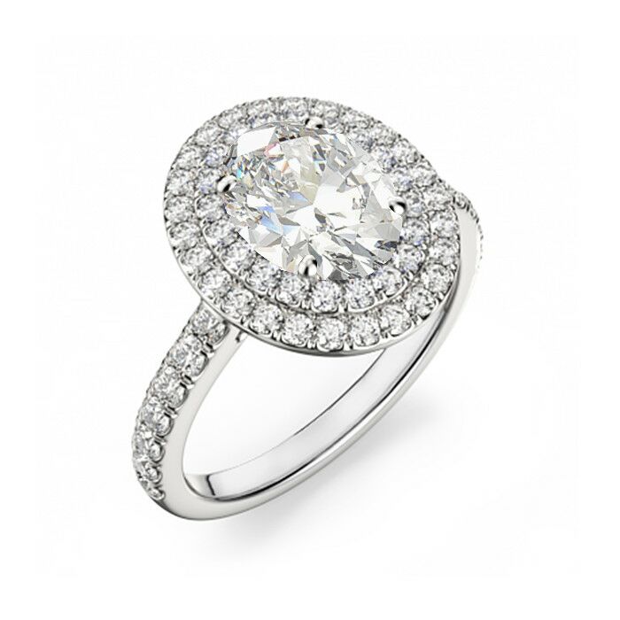 Gersande est une bague entourage sertie d'une pierre centrale ovale, personnalisable selon votre souhait, qu'il s'agisse d'un diamant, d'un rubis, d'un saphir ou d'une émeraude. Cette dernière se trouve sublimée d'environ 60 diamants aussi bien sur les 2 rangs de l'entourage que sur l'anneau. Elle est réalisable en or blanc, jaune, rose 750‰ et en platine 950‰. Classique et sophistiquée à la fois, elle est marquée par un travail minutieux de sertissage.