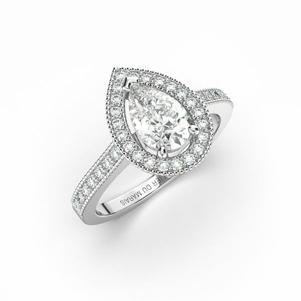 D'inspiration romantique, la bague Lyna séduit par sa délicatesse et son élégance. Selon la carnation, on préférera l'or rose, jaune, ou blanc 18 carats 750‰ ou encore le platine 950‰. Sa pierre de centre taille poire se décline selon votre guise (diamant, émeraude, saphir, rubis...) et se pare d'un entourage de diamants en serti perlé.Recevoir votre baguier