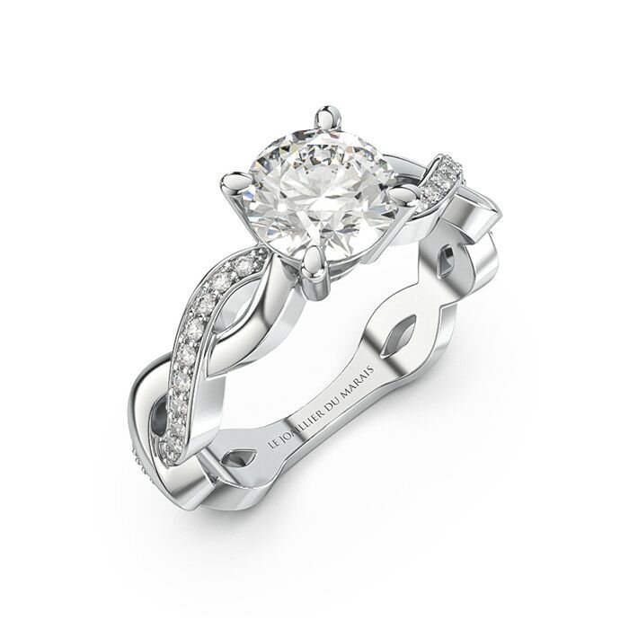 Bettina est une ravissante bague entrelacée, à la fois moderne et élégante. La monture est ornée de 40 diamants qui mettent en valeur une pierre centrale personnalisable en termes de poids et de type (saphir, émeraude, rubis, diamant, saphir teal ou tourmaline rose…). Personnalisez également le métal de votre choix : or blanc, jaune, rose 750‰ ou platine 950‰. Pour plus de personnalisation, contactez-nous !