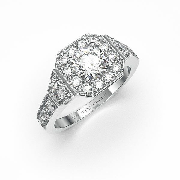 Teresa est une bague inspirée des lignes Art Déco et au caractère affirmé. Le travail du métal lui apporte un aspect anguleux et symétrique. Elle est personnalisable en or blanc, jaune, rose 18 carats 750‰ ainsi qu’en platine 950‰. 20 diamants accompagnent a pierre centrale qui est également au choix (diamant, saphir, émeraude, rubis...) Pour plus de personnalisation, contactez-nous !Recevoir votre baguier
