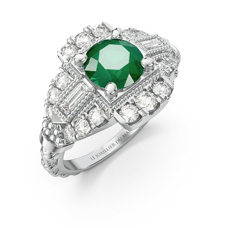 La bague Isabeau, au style vintage, est entièrement personnalisable en or jaune, rose ou blanc 18 carats (750/1000), ainsi qu'en platine 950%. Elle est sublimée par des diamants de taille brillant et baguettes qui mettent en valeur la pierre de votre choix : diamant, saphir, saphir teal, rubis ou émeraude. Contactez-nous pour plus de personnalisation !La bague Isabeau, au style vintage, est entièrement personnalisable en or jaune, rose ou blanc 18 carats (750/1000), ainsi qu'en platine 950%. Elle est sublimée par des diamants de taille brillant et baguettes qui mettent en valeur la pierre de votre choix : diamant, saphir, saphir teal, rubis ou émeraude. Contactez-nous pour plus de personnalisation !Matière : Or blancTitrage : 750‰ (18 carats)Poids métal : 6 à 7 grammesFinition : PolieType de pierre : ÉmeraudeForme pierre centrale : Taille brillantPoids en carats : 0.80 caratType de pierres d'accompagnement : DiamantsNombre de pierres d'accompagnement : 20Forme des pierres : Baguette (rectangulaire), Brillant (rond)Poids total d'accompagnement : 1.05 à 1.15 caratUn service joaillier offert à vie !