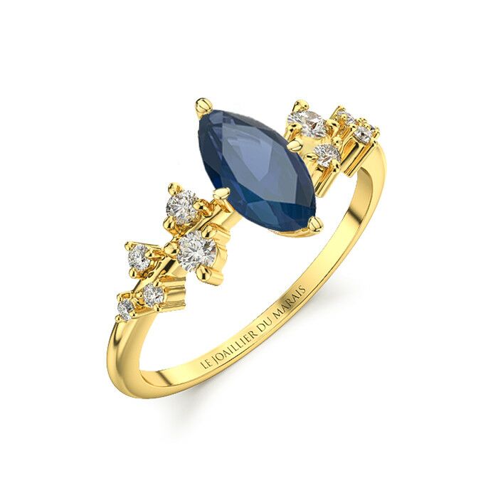 Solitaire poétique évoquant l’univers végétal, Lavana se conjugue au passé recomposé. On prendra soin de rehausser sa pierre de centre, taille marquise, avec la chaleur de l’or rose ou jaune 750‰ ou on fera vibrer le diamant incolore avec l’effet miroir de l'or blanc 18 carat ou platine 950‰. Un demi carat orne son centre (diamant, saphir, émeraude, rubis...) et des diamants viennent animer les côtés.
