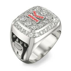 KICK est une chevalière personnalisable en or blanc, jaune, rose 750‰ ou en platine 950‰, serti de diamants totalisant environ 1.70 carats et de rubis pour un poids total d'environ 0.05 carat. Pour plus de personnalisation (la lettre centrale, dessins sur les côtés…), n'hésitez pas à nous contacter.Recevoir votre baguier