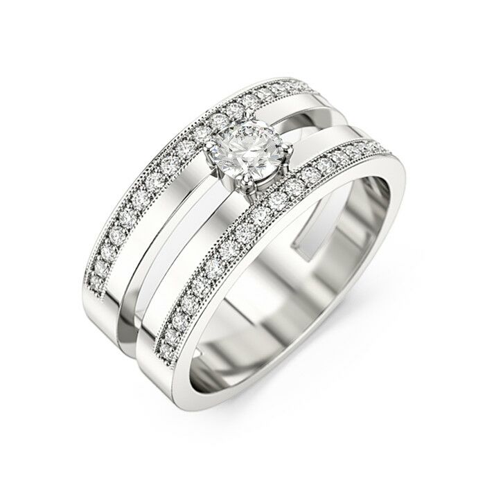 Mia est une bague personnalisable du métal (en or blanc, jaune, rose 750‰ ou en platine 950‰) à la pierre centrale (diamant, saphir, rubis, émeraude...). La monture large de la bague donne du volume et ajoute une touche de présence à votre bijou. De chaque côté de la pierre centrale, vous trouverez deux lignes de diamants, chacune avec un serti perlé subtil qui ajoute une touche d'originalité à l'ensemble.