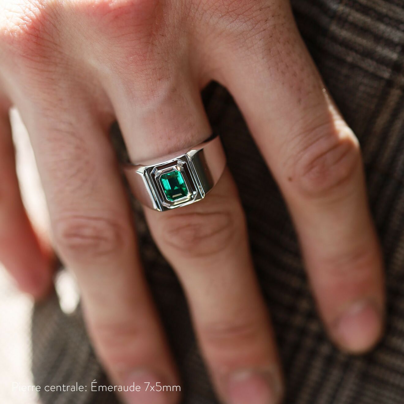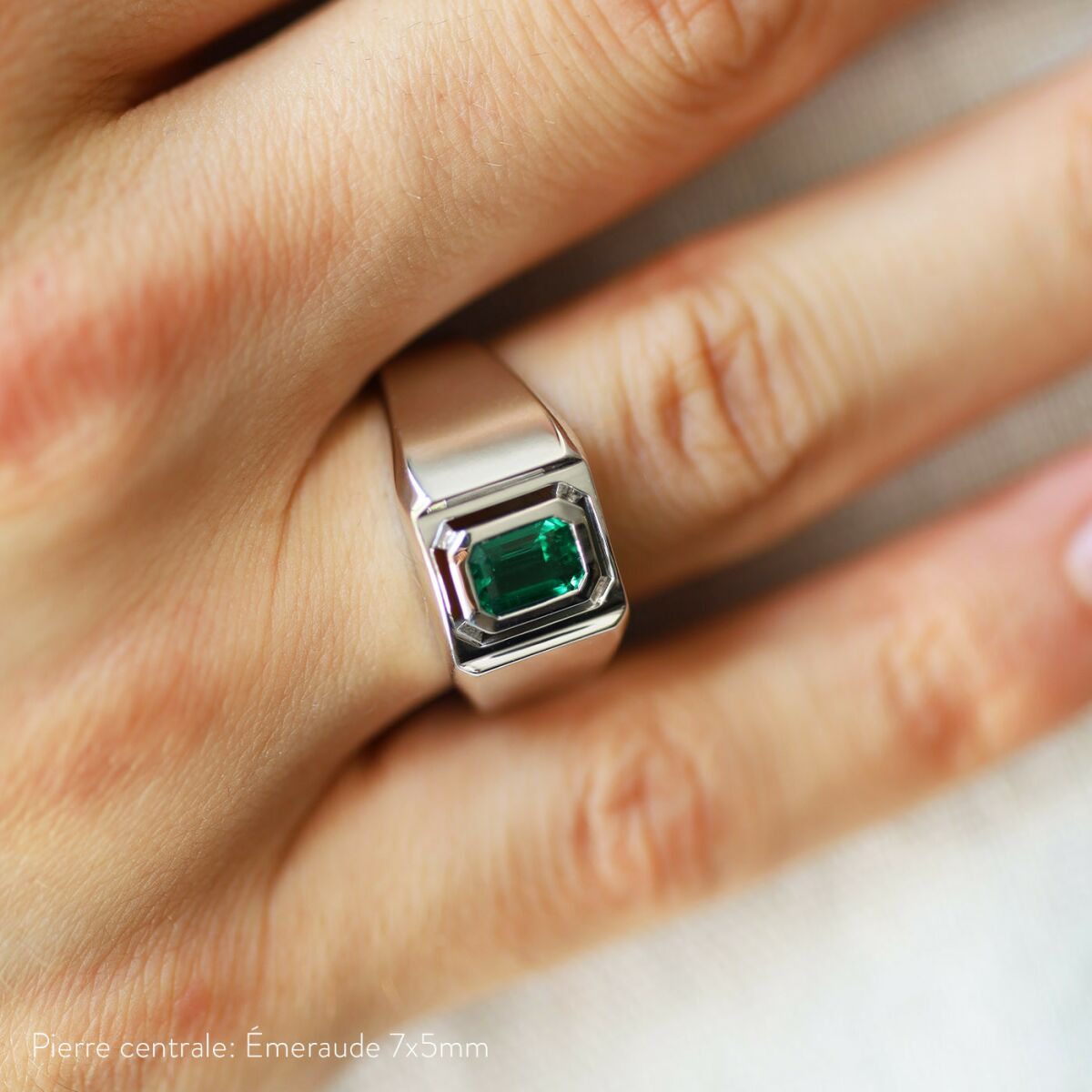 Challenger est sertie d’une pierre centrale en taille émeraude personnalisable en termes de taille, 7x5mm ou 8x6mm, et type de pierre: qu'il s'agisse d'un saphir, rubis, émeraude ou autre gemme sur demande. Sa forme permet de mettre en avant un sertissage clos qui protège et valorise la pierre centrale. Définissez également la couleur du métal précieux que ce soit de l'or blanc, rose ou jaune 750 ‰, platine 950‰ ou argent 925‰.