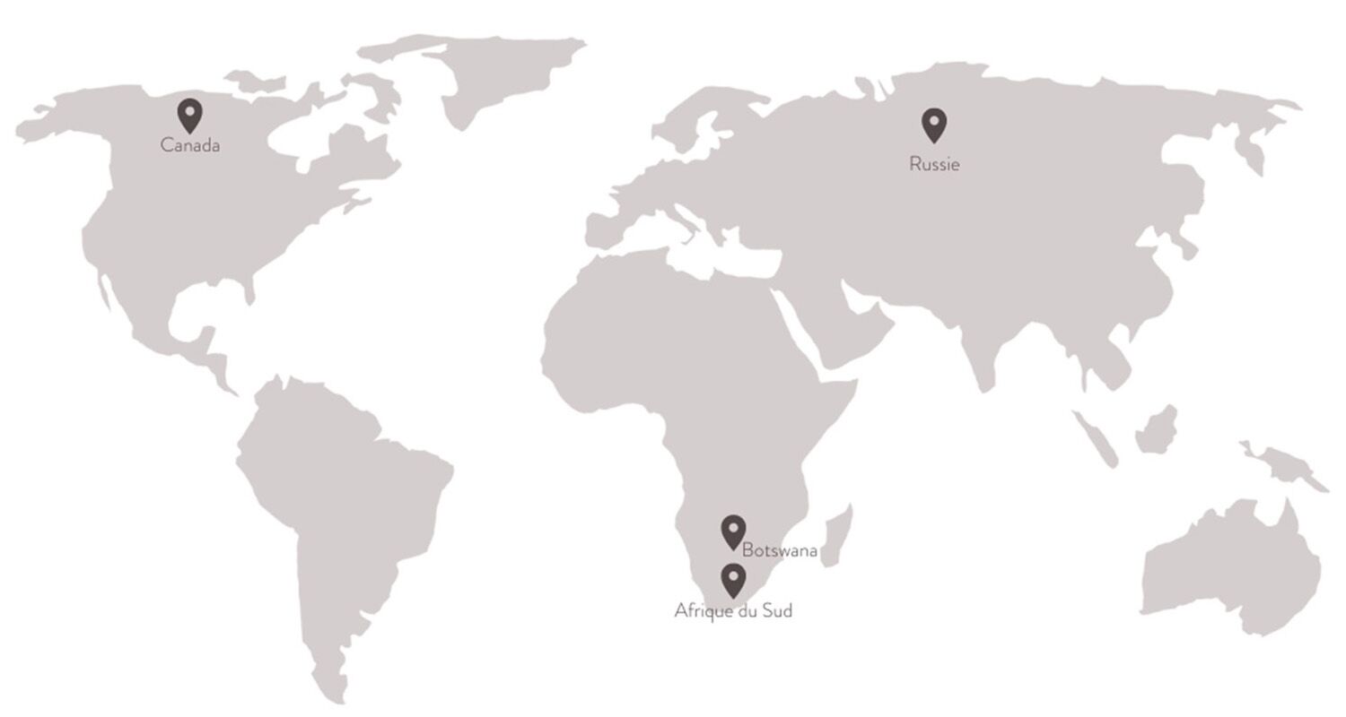 Le diamant est principalement extrait sur le continent africain, avec l'Afrique du Sud et le Botswana parmi les plus grands producteurs mondiaux. Cependant, d'autres pays contribuent également de manière significative à l'extraction de cette pierre précieuse, notamment le Canada, connu pour ses mines situées dans les régions arctiques, et la Russie, qui possède les plus grandes réserves de diamants au monde. Chaque région de production offre des spécificités uniques en termes de qualité et de taille des pierres, faisant du diamant une ressource à la fois rare et diversifiée.