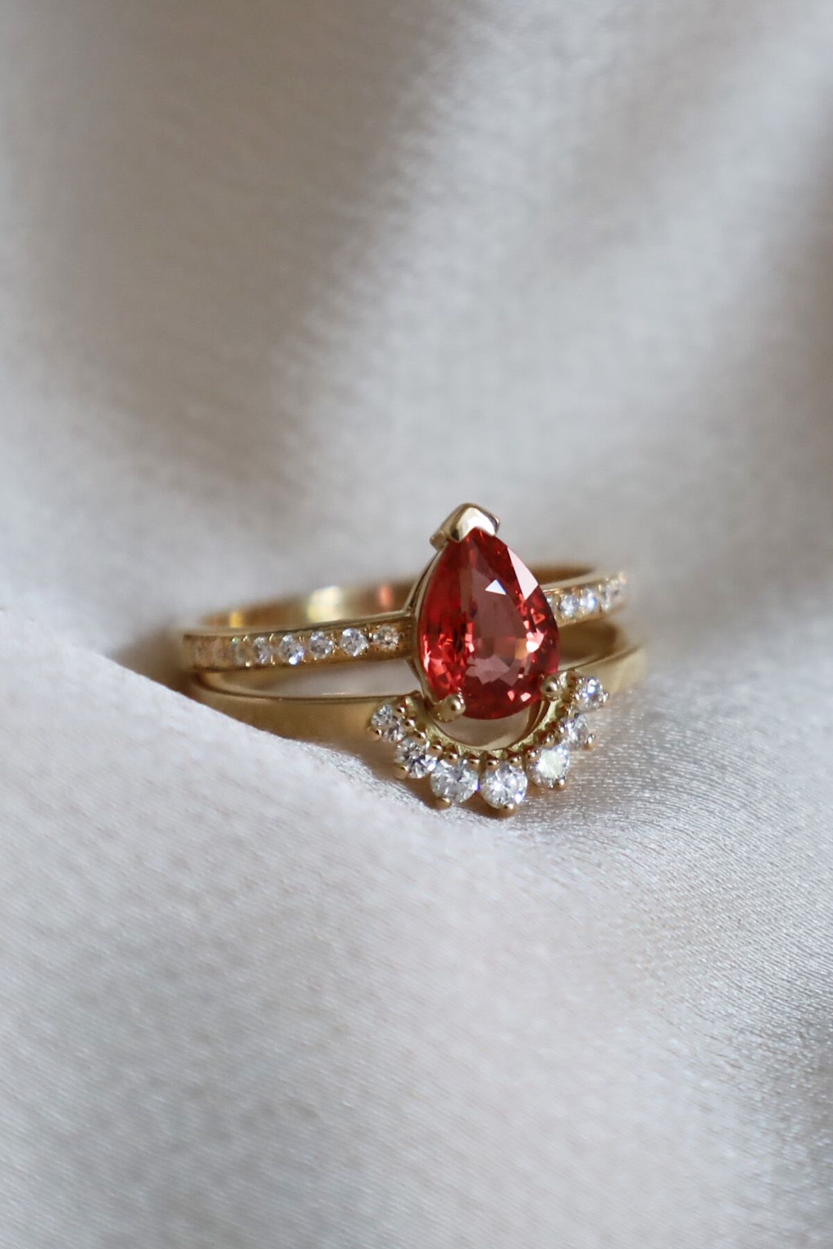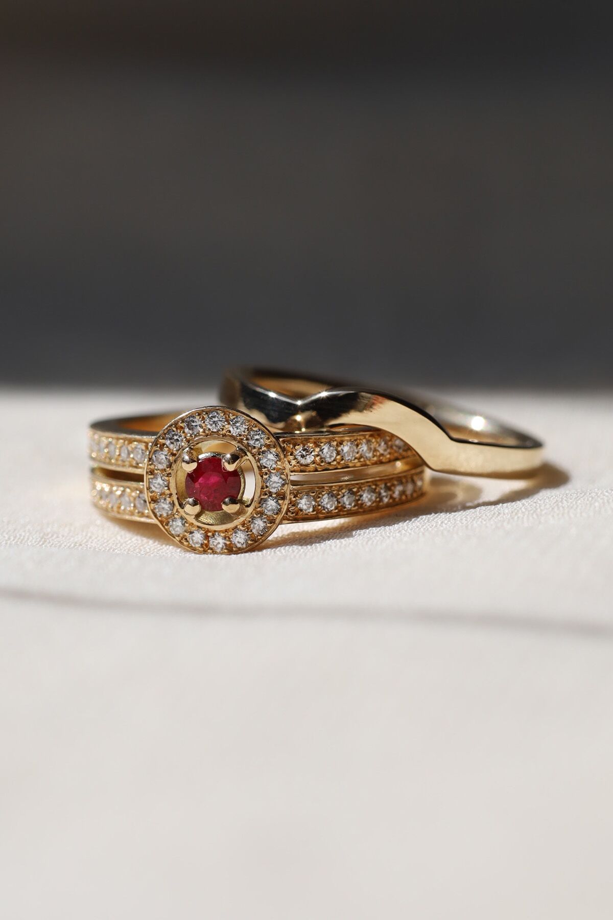Si la forme de votre bague de fiançailles ne convient pas avec une alliance droite, que vous souhaitez mettre en avant la pierre centrale de votre bague ou tout simplement vous souhaitez créer une symbiose idéale entre les deux bijoux, l'alliance ajustée est alors idéale : Marceau, Folie... Nos modèles de bagues ajustées sont pensés pour mettre en avant une bague avec une pierre centrale de taille importante. Vous pouvez sélectionner une création sertie de diamant, qui permettront de rehausser avec délicatesse la pierre centrale en question. Fort de notre artisanat, nous avons également la possibilité de créer un modèle sur mesure, adapté spécialement pour votre bague de fiançailles. Chaque idée est la bonne pour la bague que vous garderez toute votre vie. Créons ensemble votre alliance sur mesure !