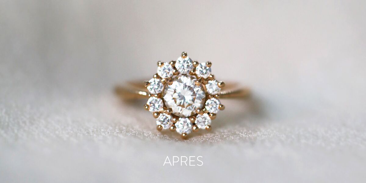 Chaque transformation de bijoux offre l'opportunité de créer un nouveau bijou tout en préservant l'histoire de l'ancien… Ici, notre cliente souhaitait transformer ce duo d'alliance et de bague de fiançailles en or jaune 750 millièmes et diamants en une ravissante bague Marguerite, notre modèle Impératrice, en or rose 750 millièmes.
